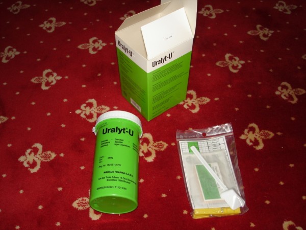 وبعدين قلنا ان لازم تشربين شراب Uralyt-U عادي تحصلينه في اغلب الصيدليات