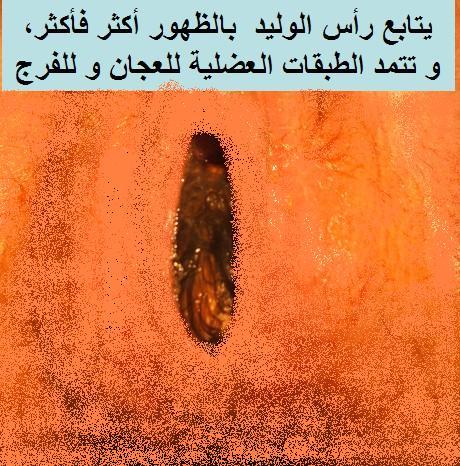 ويحدث شق الفرج حين يصبح الراس واضحا عند الدفع ( علما ان تمدد العجان يفقد هذة المنطقة الاحساس بشكل مؤقت فلا تعطى الام المخدر فى هذة المرحلة بل لاحقا عند التئام الجرح)..