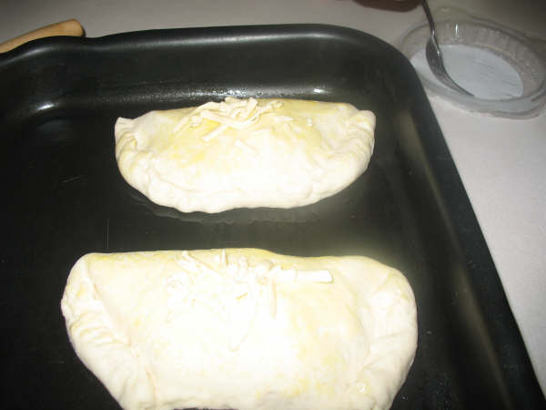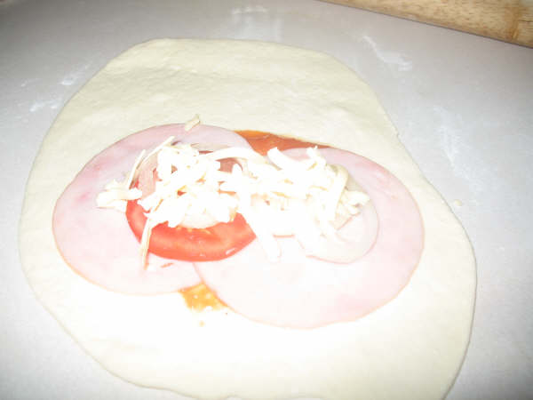 افردي العجينه وادهنيها بصوص البيتزاء حطي يا لحم مفروم او مرتديلا وشريحة طماط وبصل وسكريها با الشوكه ...