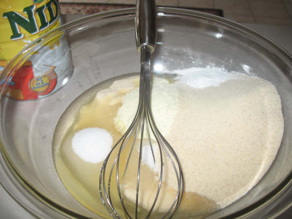 نخلط المقادير الجافة مع بعضها البعض ثم نبدأ بإضافة المقادير السائلة