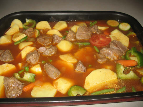 واخذت قدر ووحمست بصل ويا زيت يوم اصفر يلا حطيت اللحمه وحمستها وحطيت ملعقتين صلصه وبهرتها ومكعب ماجي وشوي ملح وشويي سكر ويوم تسبكت يلا صبيت ماء حار مغلي عليها وخليتها تطبخ شوي بعدين شلت القدر وصبيت المرقه ع الصينيه اللي فيها خضار وبعدين قصدرتها وحطيتها با الفرن لمدة سااعه ونصف وبس قدميها با العافيه ..