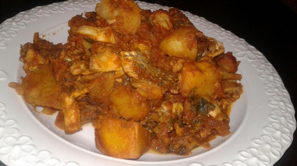 تجيبي القدر وتقصي له بصله كامله وتبشري خمس فصوص ثوم وتحمريهم بزيت بعد كذه تضيفي لهم ملعقتين كبار صلصه ثم تضيفي خليط الخلاط وتحطي البطاط المقليه ثم السمك وتقلبي بهدوء ثم تضيفي مويه تغمرهم وتخليهم يتسبكوا ولا تنس البهارات والملح ورشي كزبره وبقدونس ووطي تحت الشوله الين تحسي المويه صارت ثقيله قدميها مع رز ابيض رووعه
