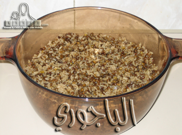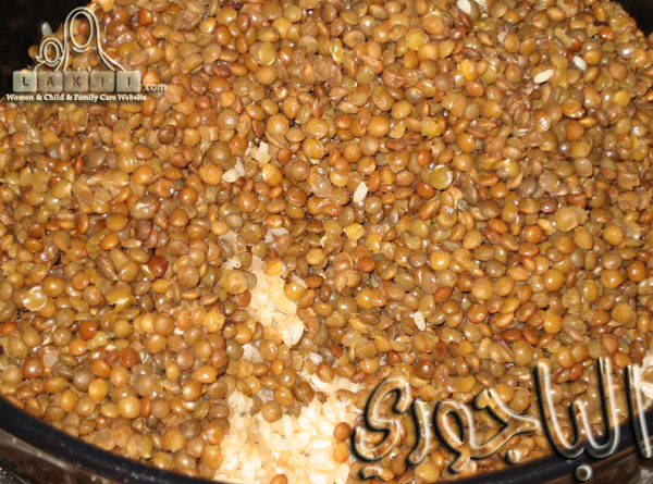 </CENTER><CENTER></CENTER><CENTER>مع التقليب المستمر لمده 3 دقائق </CENTER><CENTER></CENTER><CENTER></CENTER><CENTER></CENTER><CENTER>ثم نضيف عليه العدس المسلوق والمصفى ونقلب برفق شديد حتى يختلط الجميع ومن ثم نضيف ماء سلق العدس والملح. </CENTER><CENTER></CENTER><CENTER></CENTER><CENTER></CENTER><CENTER>يغطى ويترك على النار الهادئة حتى يتم النضج, وهذا شكله النهائي ان شاء الله..