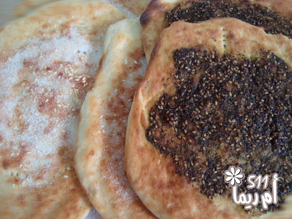 ونحطها على المقرصة بعد تسخينه ونضيف على الوجة سكر وسمسم أو زعتر وزيت