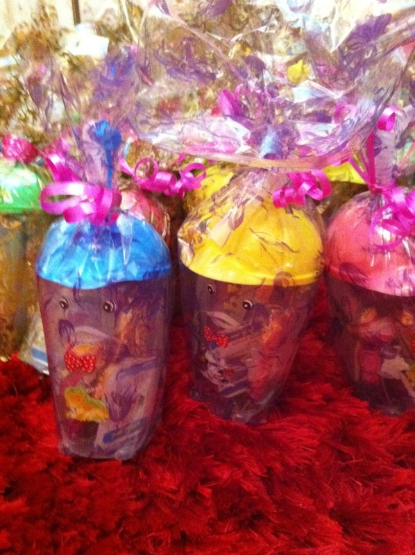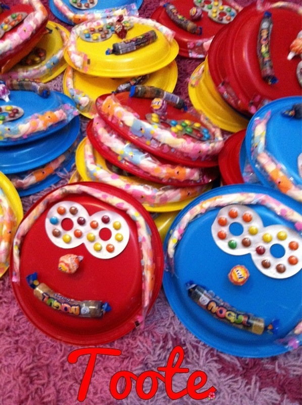 صحون ملونة ملصق عليها الحلاويات ومن الخلف شبس