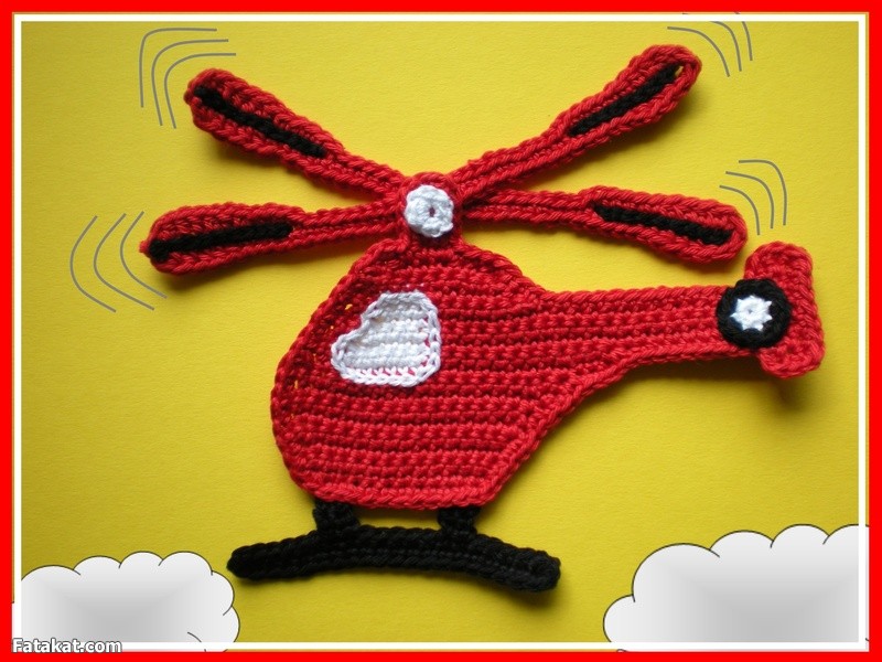 هي انك بتعملي عدد من السلاسل وتشتغلي عليهم حشو وتزودي من الاطراف وكل دور تزودي من الاطراف تقريبا اربع او خمس ادوار وبعدين بالدور الخامس تعملي مثلا سلسله وبدل ما تطلعي لفوق لا تنزلي بها لاول الحشو بالدور السابق وتشتغلي سلسله طويله شوي وهذه بمثابة ذيل الطائره وتبدأين تشتغلي عليها ادوار حشو مع جسم الطائره مع التنقيص قليلا من الجهه المقابله للذيل تعملي حوالي اربع ادوار حشو للذيل ثم تشتغلين على جسم الطائره وتبدأين تنقصي في عدد غرو الحشو حتى تحصلين على شكل الطائره المرغوبة وفي منتصف الرأس تطلعين بثلاث حشو دورين او ثلاثه وتشتغلين مروحة الطائره وهي سلسله طويله ثم في اول السلسله واخرها تعملين غرزة نصف العامود ومنتصف السلسله تعملين الحشو حتى تعطيكي شكل المروحه مثل الصورة وتعملي منها اثنين وتشبكيهم برأس الطائره على هيئة الاكس وتشتغلي الارجل من تحت بغرزة الحشو وبلون اخر وبأخر ذيل الطائره تشتغلي شوي ادوار مثل الشكل الاسطواني وبكده تكوني عملتي شكل الطائره