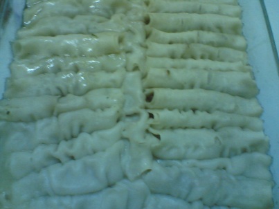 في الأعلى وتغلق الاطراف العلويه ثم تلف مثل الاصابع ثم نحضر صينية بايركس ونضع في اسفلها