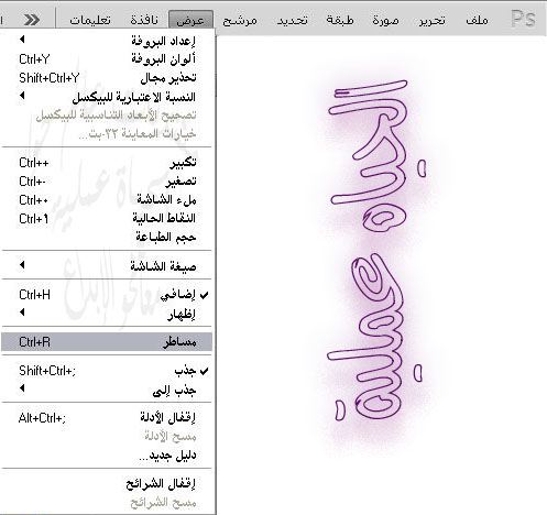 1- لإظهار المسطرة أما عن طريق ضغط ctrl+R أو عن طريق القائمة كما موضح بالصورة