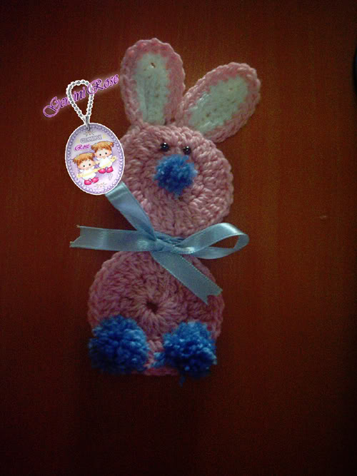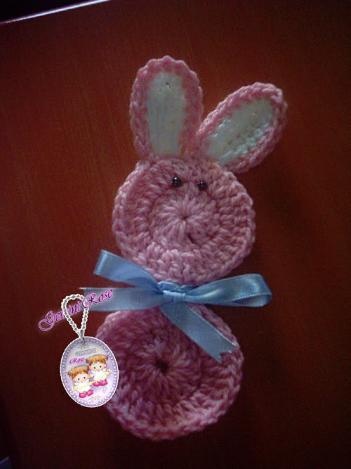هنا عملت عيون الأرنوب من الخرز وخيطتها بالخيط العادي وعملت فيونكة الرقبة بالستان الرفيع وباللون المناسب