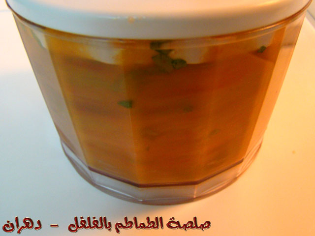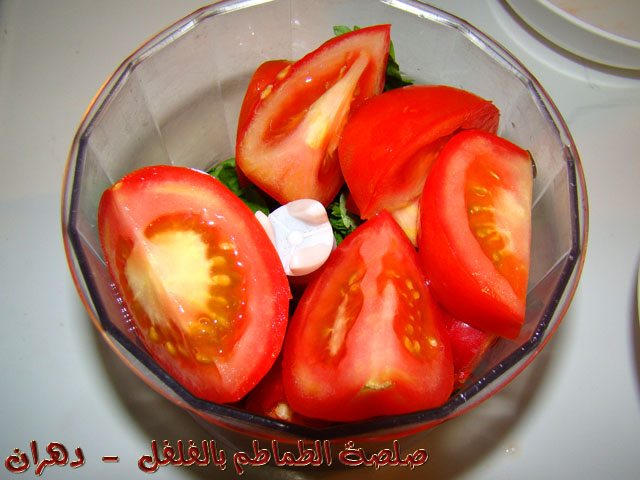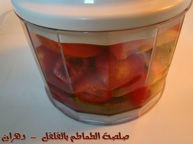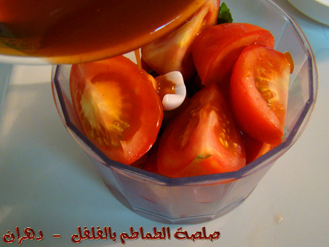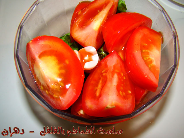 ثم نضع الطماطم المقطع ونصب عصير الليمون على المكونات ثم الشطة ثم زيت الزيتون بشكل دائري .