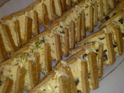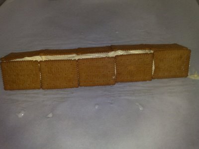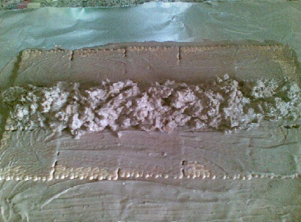 3- نصف 3 أعمده من البسكويت على قصدير ثم توضع الحشوه في العامود الأوسط .