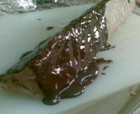 وأنا دهنته بخليط من نوتيللا وحليب سائل وبودرة كاكاو لحد لما بيصير شكلها متل الشوكولا السايحة