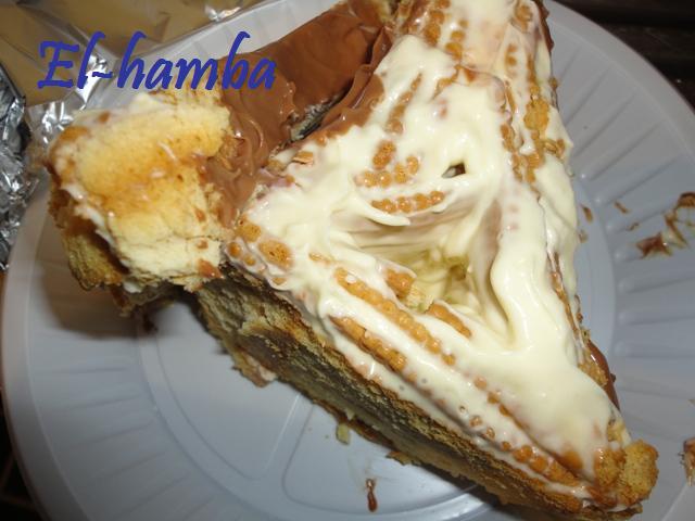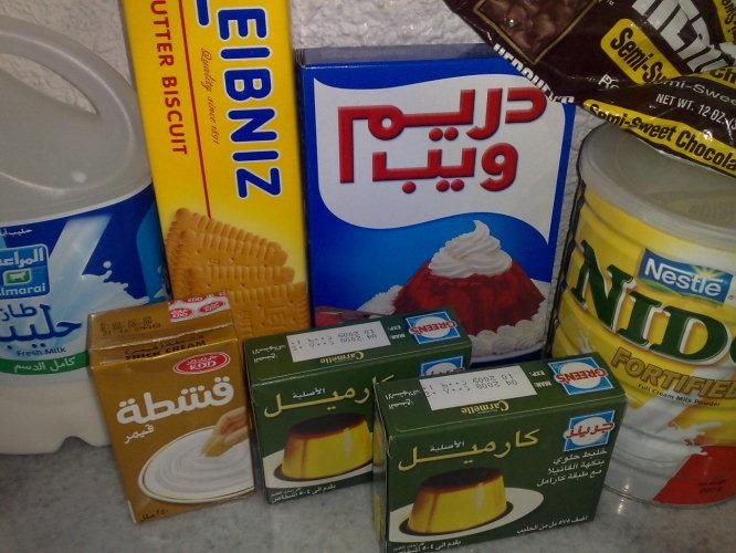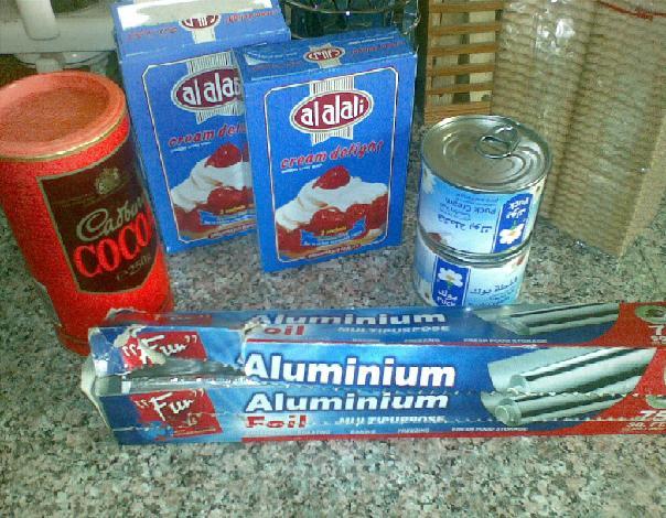 - ثم تاخذين صينية تقديم عادية وتغلفينها بقصدير ثم تنقعين البسكوت بحليب وعلى طول تشيلينه وتصفينه بالصينيه على شكل مستطيل ثم تضعين الخلطه ثم بسكوت منقوع الى ان تكونين 3 طبقات من البسكوت وبينهم خلطه وآخر شي هم تحطين الخلطه .