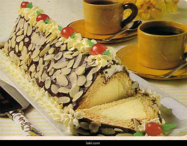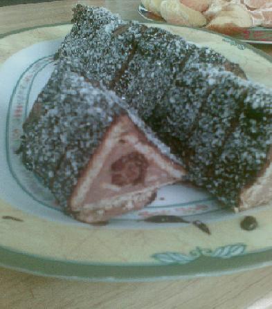 ولما يجمد وتفتحوه إما بتخلوه متل ما هو وبتقطعوه على شكل مثلثات أو بتدهني عليه بصوص الشوكولاه