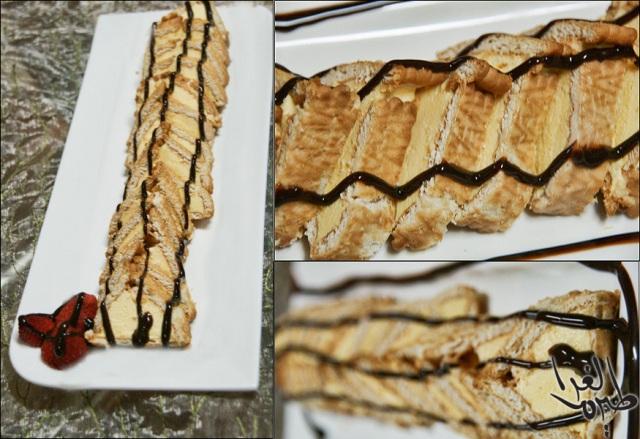 تحطين الخلطه في البسكوت الوسط وترفعين القصدير من الجنين يصير شكله مثلث وتحطيتنه بالفريزر