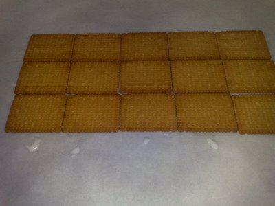 يكون الرص 3 حبات افقي و7 رأسي وادهنيهم من خليط الدريم ويب قليلا ورصي مره ثانيه فوقهم بسكويت ( مغمس بالحليب)