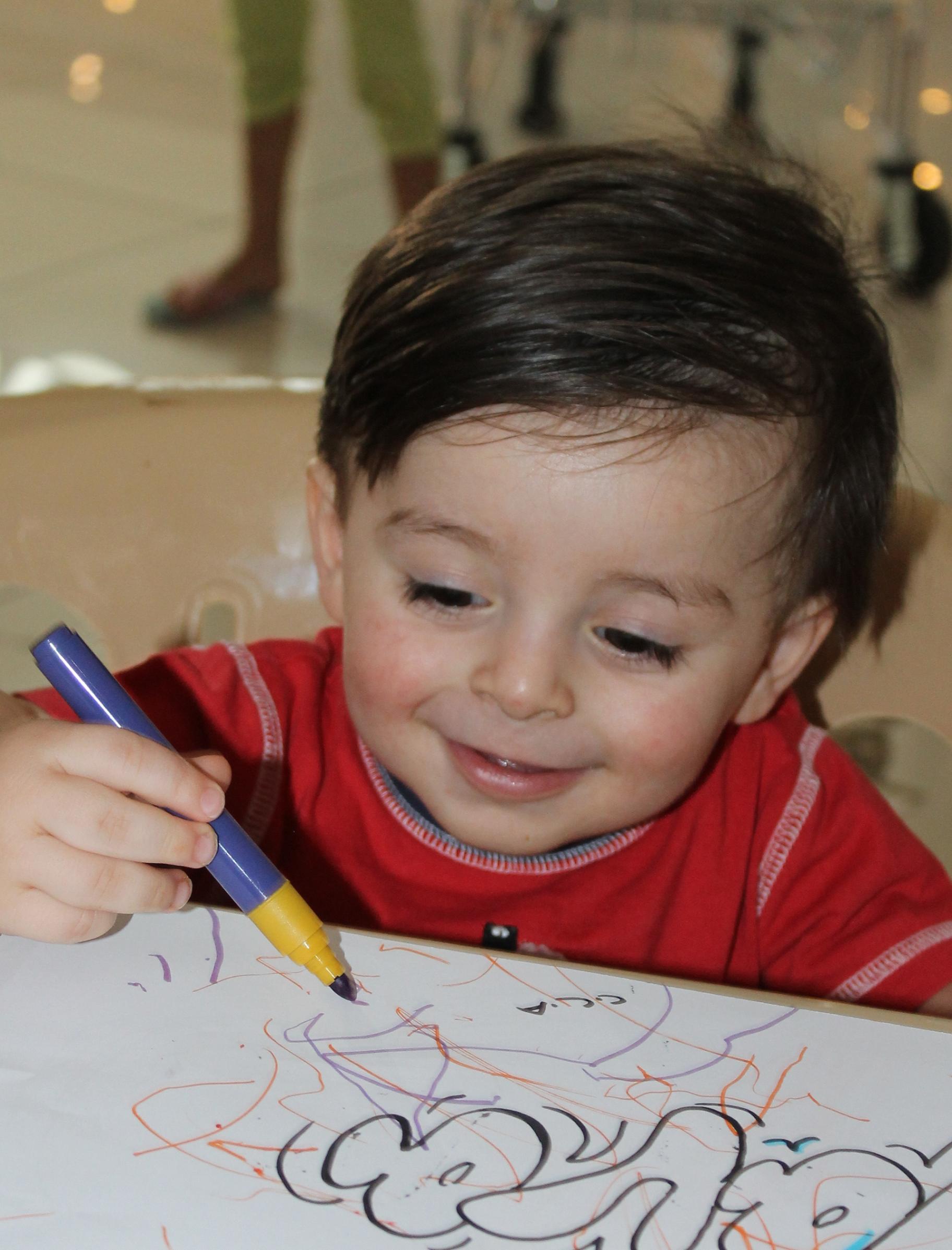 وبدا "الرسام الصغير" منهمكا في فن التلوين مع تطور واضح في أدائه وطريقة التلوين ومسكه للألوان مما يؤكد بأن