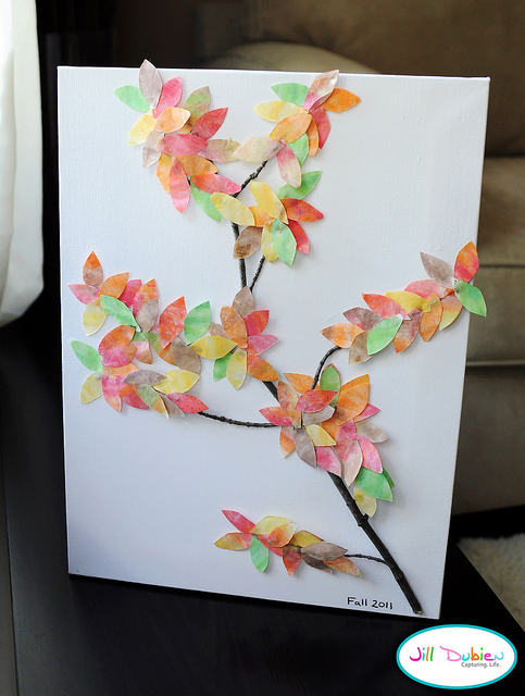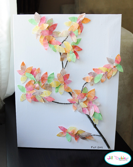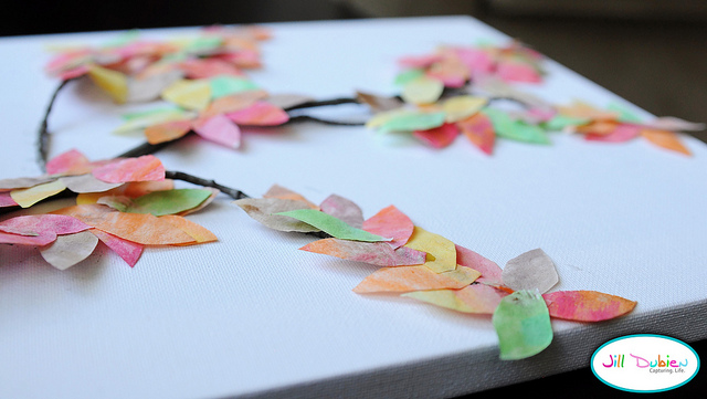 وأبدأئي بإلصاقها على اللوحة بعد أن تلصقي فرع الشجرة