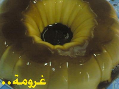 يوضع القليل من الكراميل في قاعدة قوالب أو سلطانيات، ثم يضاف الخليط.