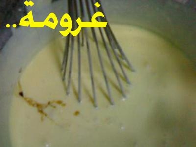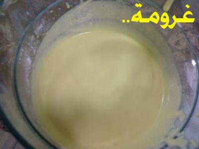 أولا ذوبي الجيلاتين بالماء الدافىء وحركيه جيدا الى ان يذوب واتركيه جانبا مثل الصورة..