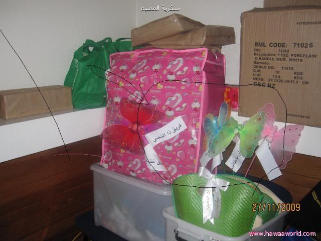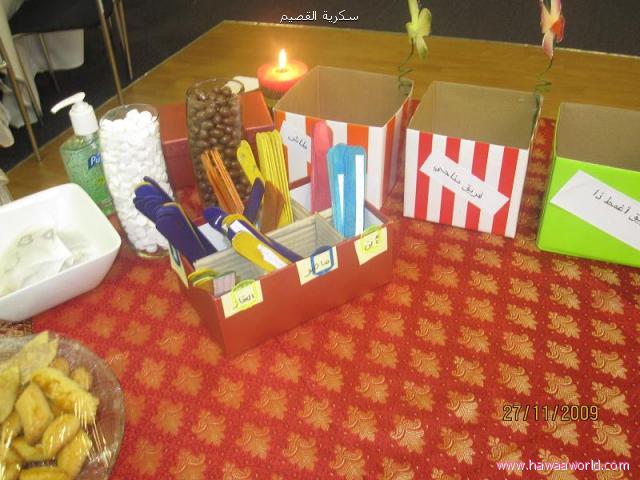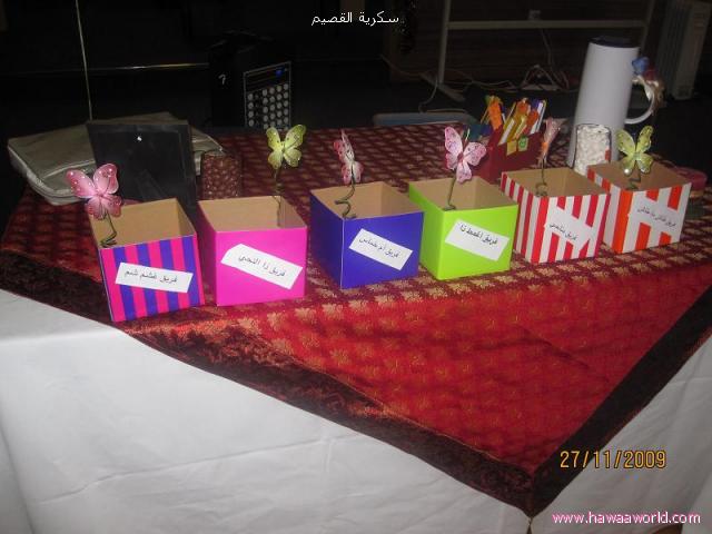 بدانا في المسابقة وهي عباره عن 6 طاوالات او ستة فرق وكل طاوله وظعنا فيها فراشة تحمل اسم الفريق بس للاسف نسيت اصورها الهدف منها الذي يعرف الاجابة الاول يرفع الراية بس لقيت صوره لهن مع الاغراض :eek: