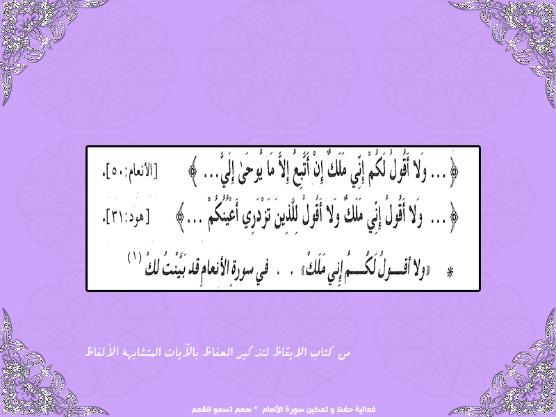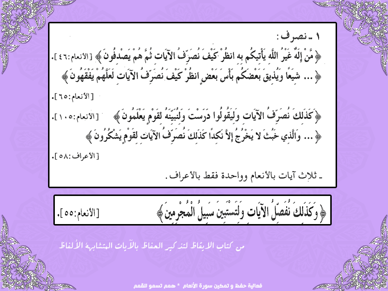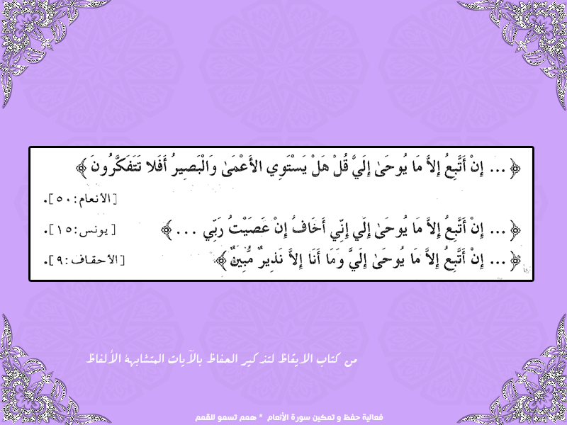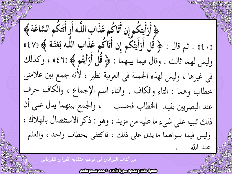 قُلْ أَرَأَيْتَكُم إِنْ أَتَاكُمْ عَذَابُ اللَّهِ أَوْ أَتَتْكُمُ السَّاعَةُ أَغَيْرَ اللَّهِ تَدْعُونَ إِن كُنتُمْ صَادِقِين ) .......... لما اوصل لهذي الايه اوقف واكمل من الايه اللي في الوجه السادس (قُلْ أَرَأَيْتَكُمْ إِنْ أَتَاكُمْ عَذَابُ اللَّهِ بَغْتَةً أَوْ جَهْرَةً هَلْ يُهْلَكُ إِلاَّ الْقَوْمُ الظَّالِمُونَ ربطت بينهم انه الساعه لعظمها تكون الاولى