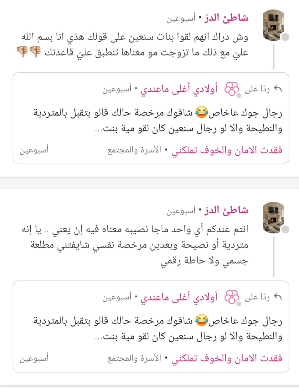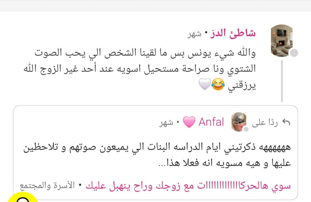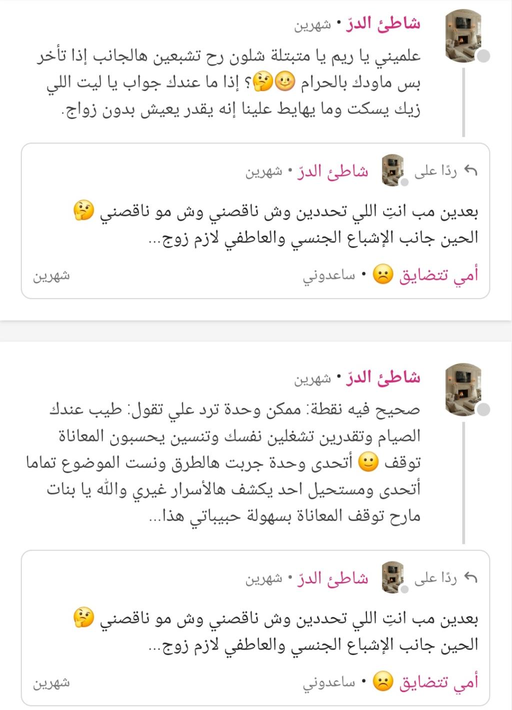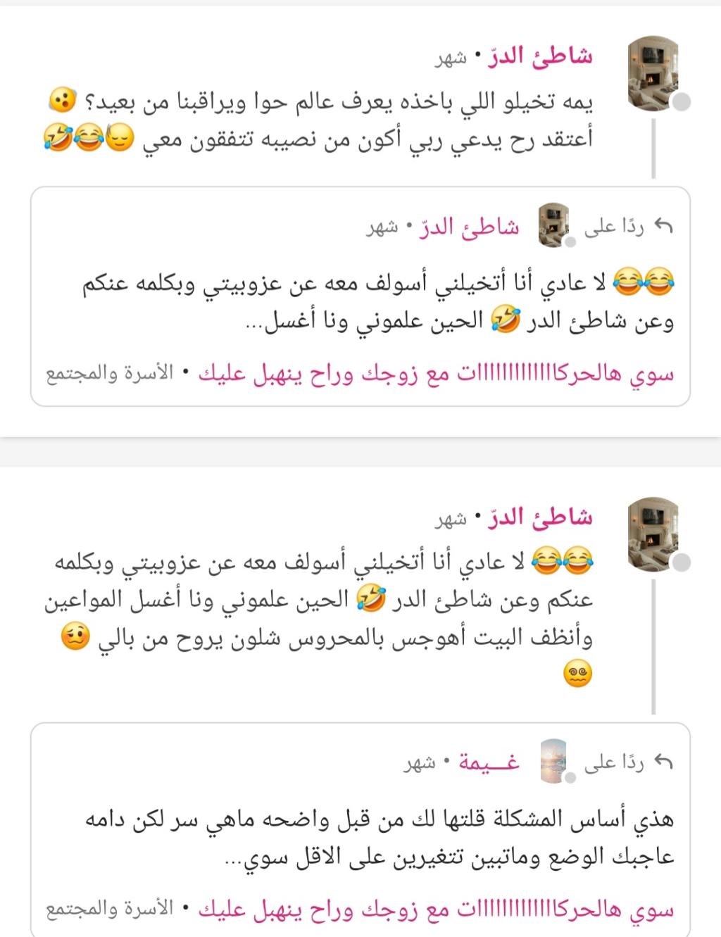 مو بس انتِ اللي تشوفين حتى هي شافت ردودك يا معتوهة واكيد هي من زمان ملاحظة لسانك الوصخ واتهاماتك الكاذبة على البنات مسوية تهايطين اسكتي بسمو بس انتِ اللي تشوفين حتى هي شافت ردودك يا معتوهة واكيد هي من زمان ملاحظة لسانك الوصخ واتهاماتك...