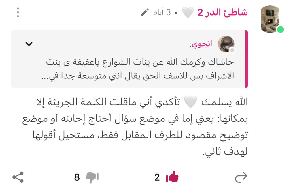 زمان أنزل موضوع تكتب تعليقات انتِ فيك وما يخطيك ونتِ هدفك قذر ويلا بلغوا عنها الادارة كل ذاك الوقت داعمين لتحريشها وتقصقص تعليقاتي مع المتزوجات وتقول تتابع رضوى هذي قليلة ادب ونا ماكان معي وقتها احد الا وحدة ثنتين وكنت أطنش شوي لكن بصراحة جا وقت إني أتكلم لانها ماوقفت على كذا بدت تسيء لوالدينيزمان أنزل موضوع تكتب تعليقات انتِ فيك وما يخطيك ونتِ هدفك قذر ويلا بلغوا عنها الادارة كل ذاك...