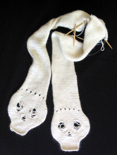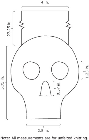 To make the skulls identical, the scarf is knit in two pieces from the skulls up and then grafted together at the middle. Since I don't like long scarves, I designed a finished length of about 60 inches. If you prefer longer scarves or just hate the idea of have left-over yarn, continue knitting each half until close to the end of each skein; just be sure to leave about one yard for grafting the two sides together.