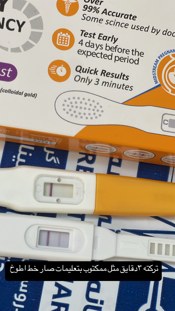 مرحبا بنات دوره متاخره لها ٩يام سويت ختبار اول طلع سلبي رجعت سويت ختبار ثاني طلع خطين واحد خفيف بعدها ب٣دقايق نتظرت مثل ماكتوب بتعليمات ضهر خط اوضح