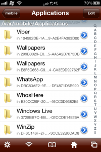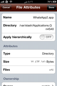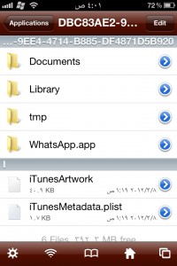 حسناً اليكم الطريقة : اولاً تحتاج الى جيلبريك و ثانياً الى برنامج ifile … ندخل الى برنامج ifile نذهب الى var/mobile/ ثم ندخل الى applications و نبحث عن برنامج الواتس اب