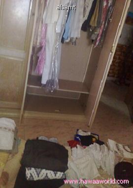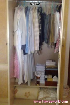 بعد ما مسحت الرف مرخته بزيت عطري وفرزت الملابس ورتبتها وبخرت الدولاب