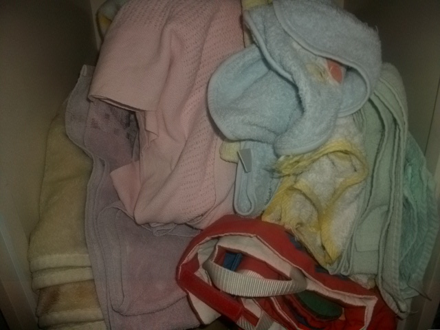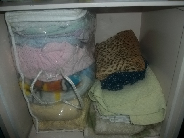 وهنا الرف اللي تحت للبطانيات الصغار والفوط بناااتي دايم حوسونها وصورتها لكم قبل وبعد