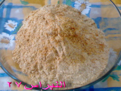 1- نحمس على النار (2ك حليب بودرة) حتى يشقر ثم يوضع في زبدية كما في الصورة :
