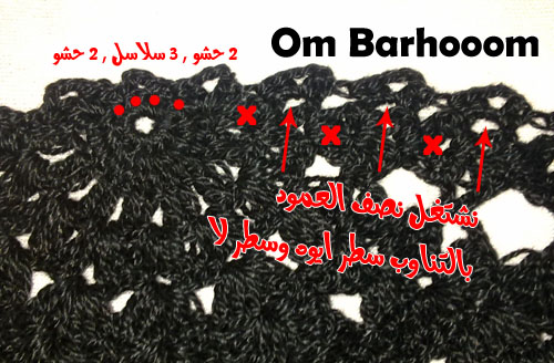 شوفي الصور وركزي ... اول ما بدينا الحواف عملنا نصف عمود في السطر السابق ..... بعدين عملنا (2 نصف عمود + 3 سلسلة + 2 نصف عمود) في السطر اللي قبله .. ومن بعدها نبدأ نسيب سطر ونشتغل في سطر ...