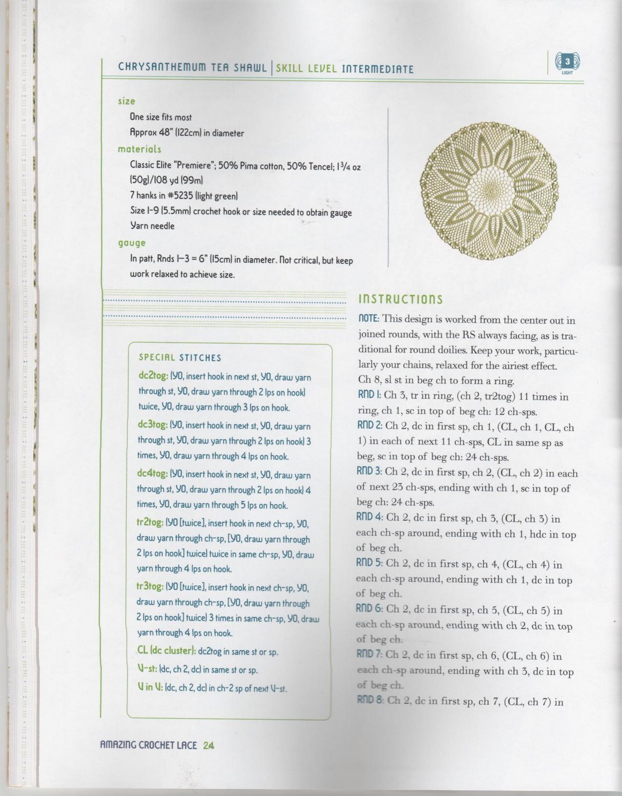 Crochet info: Substitute the first dtr each round with 4 ch. Finish each round with a sl st at beg of round.