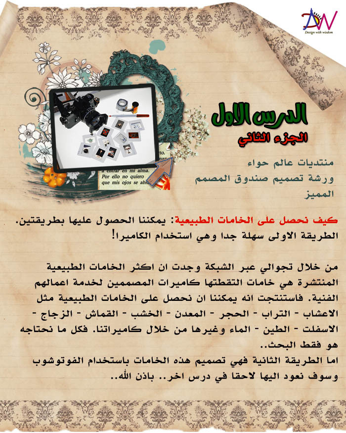 استخدمت كاميرتي الغالية لالتقاط كل ما اعجبني و شعرت بانه يمثل خامة قد تساعدني في عمل ما.. واصبح لدي بعضا من الخامات ويمكنني معالجتها عند الحاجة باستخدام الفوتوشوب وسنعود الى ذكر ذلك في نهاية الدرس باذن الله