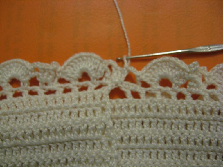 السطر الثاني في هذا السطر راح نبتدي بباترون النقشه لذيل الفستان اشتغلي منزلقه باول السطر ثم 1سلسله ثم اشتغلي غرزه حشو واحده يعني عمود بدون لفه ثم اشتغلي 5 سلسله ثم غرزه حشو فوق العمود التالي من السطر السابق كرري ال 5 سلاسل كمان مرتين كما في الصوره ثم اشتغلي حشو فوف العمود الذي يليه من السطر السابق ثم اشتغلي ايضا حشو في السلسله التاليه من السطر السابق وفي العمود الذي يليه من السطر السابق يعني حيصير عندك 3 حشو ورا بعض كرري العمليه لاخر السطر بنفس الطريقه اي خمس سلاسل 3 مرات ثم 3 حشو في اخر السطر اختمي بغرزه حشو واقفلي بمنزلقه مع اول غرزه حشو في بدايه السطر واطلعي 3 سلسله لفوق كبدايه للسطرالثالث يتبعالسطر الثاني في هذا السطر راح نبتدي بباترون النقشه لذيل الفستان اشتغلي منزلقه باول السطر ثم...