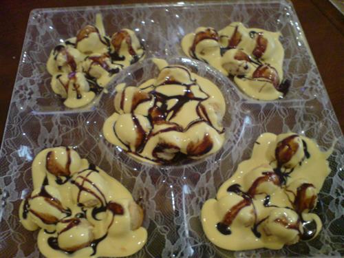 وهذي طريقه ثانيه للتقديم(تحطين عود اسنان على كل كره من كور البف باستري عقب ما تصبين الصلصه عليها)