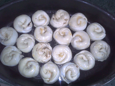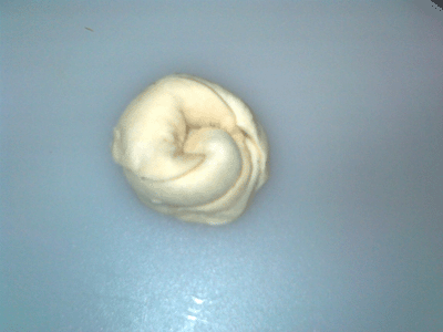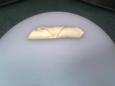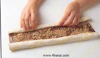 3ـ لفي جانب من العجينة مثل السوسرول الى ان تصلي الى المنتصف....ثم لفي الجانب الاخر بنفس الطريقة الى ان يلتقيا في الوسط...والصقيهما مع بعض بقليل من الماء.