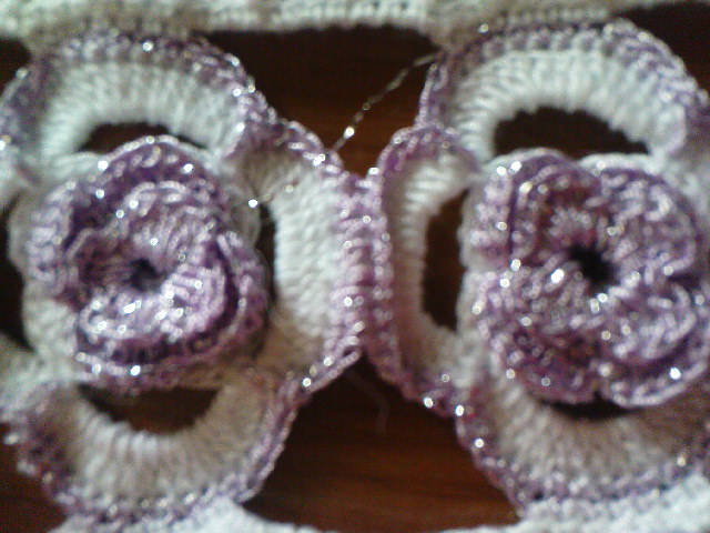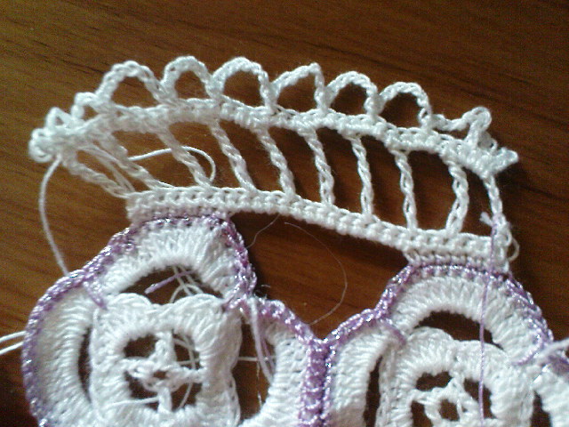 هذه عينة راح اشتغل عليها للشرح هنا الجزء العلوي يعني الرقبة نشتغل 7 غرزات حشو فوق البتلة ثم نعمل 9 سلاسل ونصل بالبتلة الثانية ب7 غرز حشو وهكذا ثم نطلع ب4 سلاسل وسلسلتين ونلف الخيط على 3 ونعمل عامود وبين كل عامود سلسلتين وهكذا
