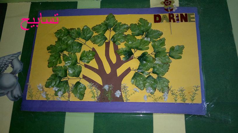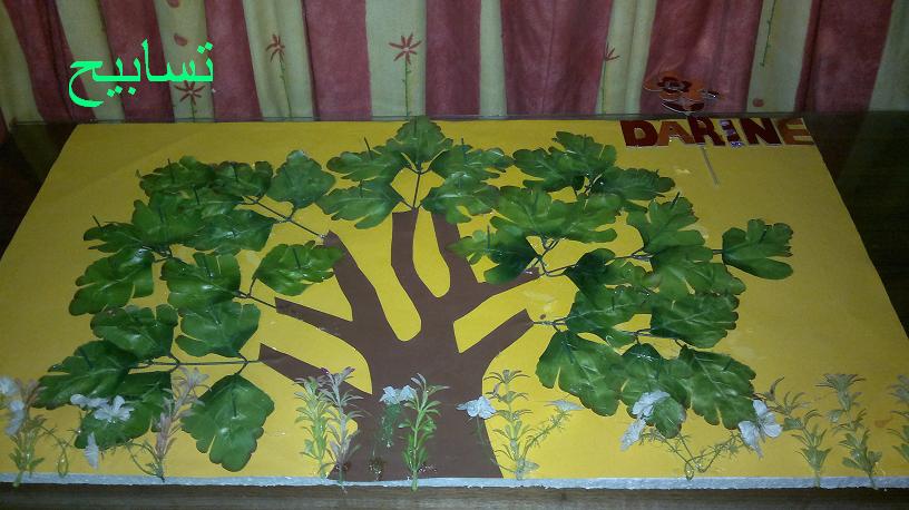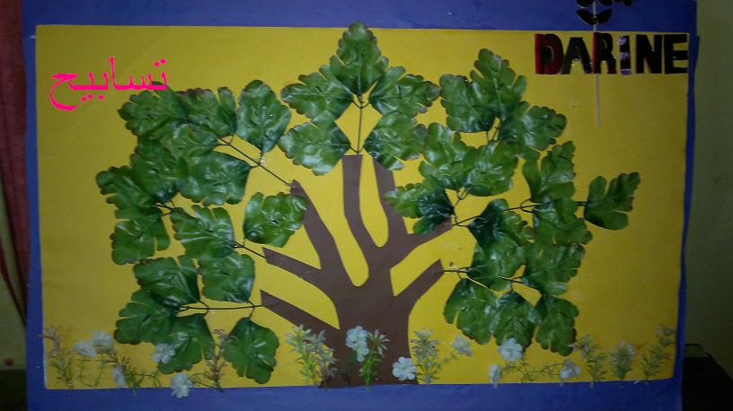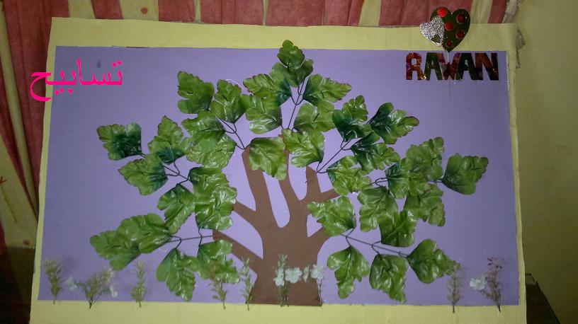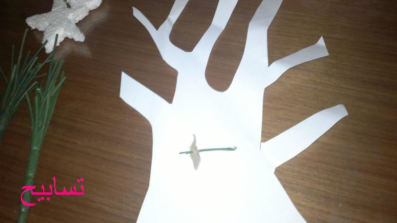 ** رسمت شجره على ورق ابيض وقصيتها وبعدين على الكانسون البنى ولصقتها بالغراء الابيض وثبت الفروع...