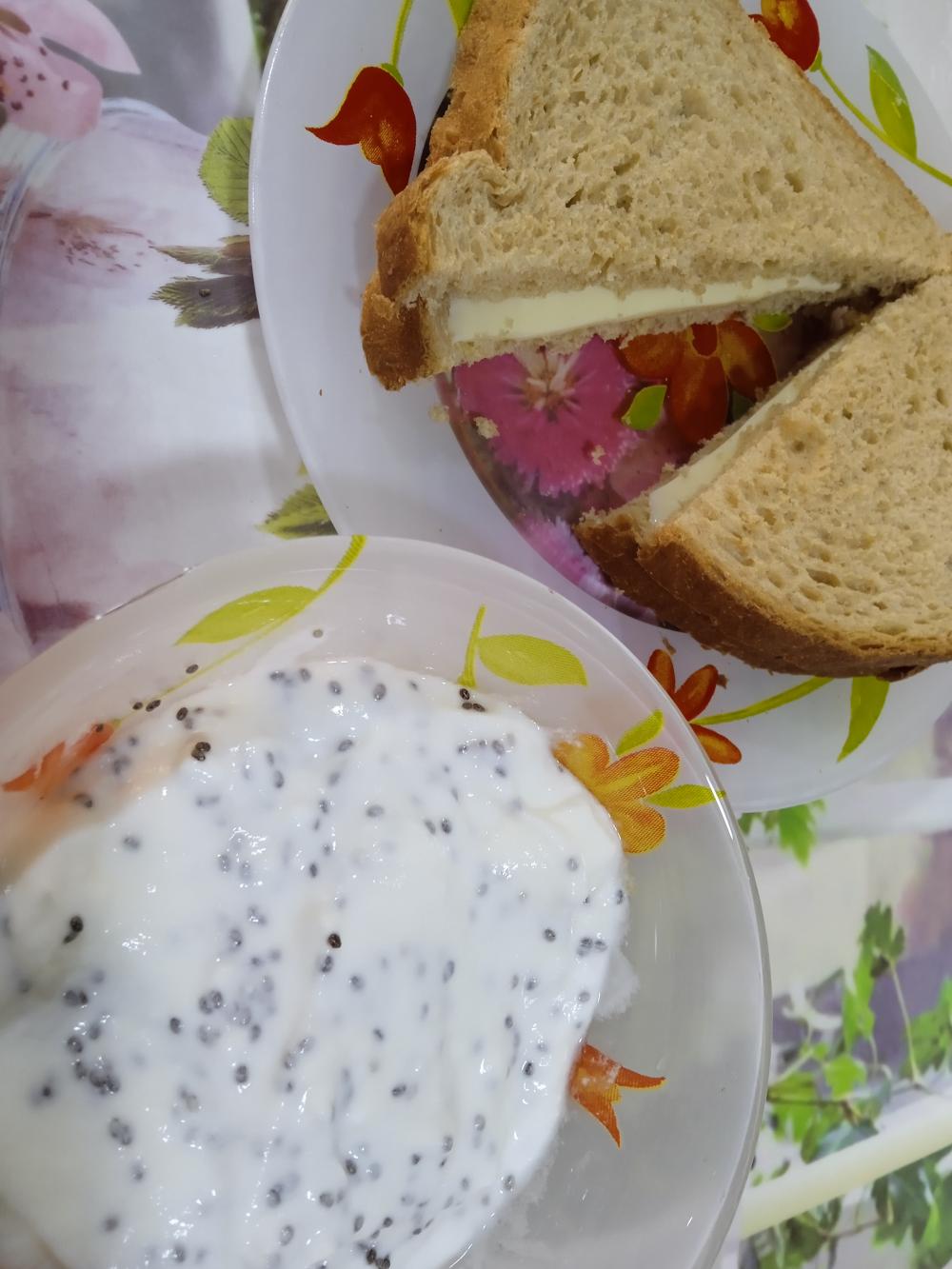 زبادي مع بذور شيا+ ٢ توست بر مع شريحه جبن سلايس