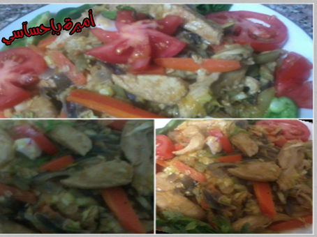 نقطع صدورة الدجاج والخضروات إلى أصابع ، ثم نضع الزيت على النار ونضيف البصل ونقلبه حتى يدبل نضيف الدجاج بعدين الكوسا والجزر ( أنا أضفت كوب ماء عشان تستوي الخضروات ) بعدين منضيف الفلفل الرومي ونضع الملح والتوم ورب البندورة ونغلق القدر ونتركهم على النار حتى يستووا نضع الملفوف والزنجبيل والكاري ونقلبهم لمدة خمس دقايق ..