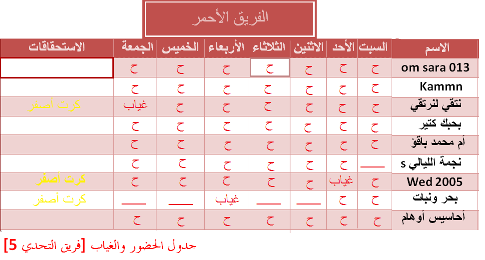 أنا لما أعدت طالع أسباب الغياب والحضور بديت من الأسبوع الأول ، طبعا أنا عندي عاللاب عاملة لكل أسبوع مجلد فيه جداول الحضور والغياب والوزن .. فأنا كتبتهم على حسب الجداول يلي عندي يلي كنت نزلها يوميا بآخر كل أسبوع ..