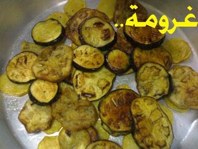 صفي البطاطس المقلية بصينية الفرن ثم الباذنجان ثم صبي الصلصة فوقهم وانثري الفلفل الحار على الوجه بدون تقطيع ورشي الخـل على الوجه ودخليهم الفرن لمدة 15 دقيقة على 180 ثم حمري الوجه وقدميها..