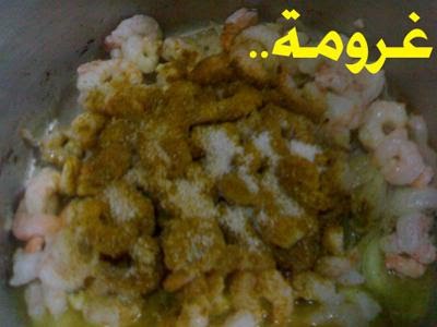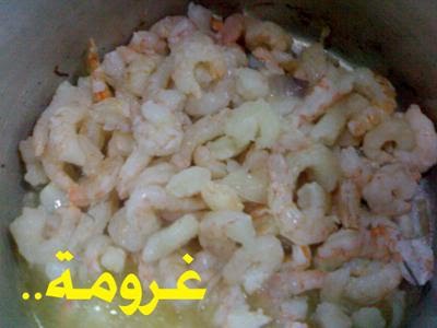 اقلبي البصل ثم الروبيان ثم البهارات ثم الخضار ونقلب لحد ما تتسب ، حلاة هالطبق حااااااااااااااار :p..