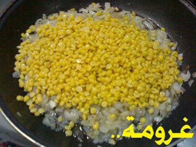 نطحن نصه بالخلاط الكهربائي وبعدين نحمس البصل المفروم بجدر بشوية زيت لحد ما يتغير لونه ثم الثوم والعدس اللي ماطحناه والبهارات ونقلب ثم نضيف الشعيرية و نصب خليط العدس المطحون عليه..