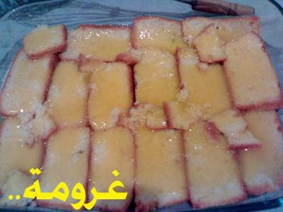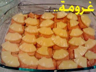 صفي الكيك بالصينية ثم شربيه نص علبة المانجو ثم صفي البسكويت وشربيه الباقي من المانجو ونص ماي الاناناس ثم صفي شرائح الاناناس فوق البسكويت ، الخلطة :نص ماي الاناناس الباقي وعلبة المانجو والكريم كراميل والقيمر اخلطيهم عدل وصبيهم فوق الاناناس ثم زيني بخطوط رفيعة من الكراميل وزينيها بقطعة اناناس..