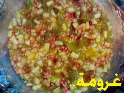 اخلطي الفواكه بعد تقطيعها الحجم اللي انتو حابينه ثم صبي عليهم العصير وخليهم لحين التقديم ..
